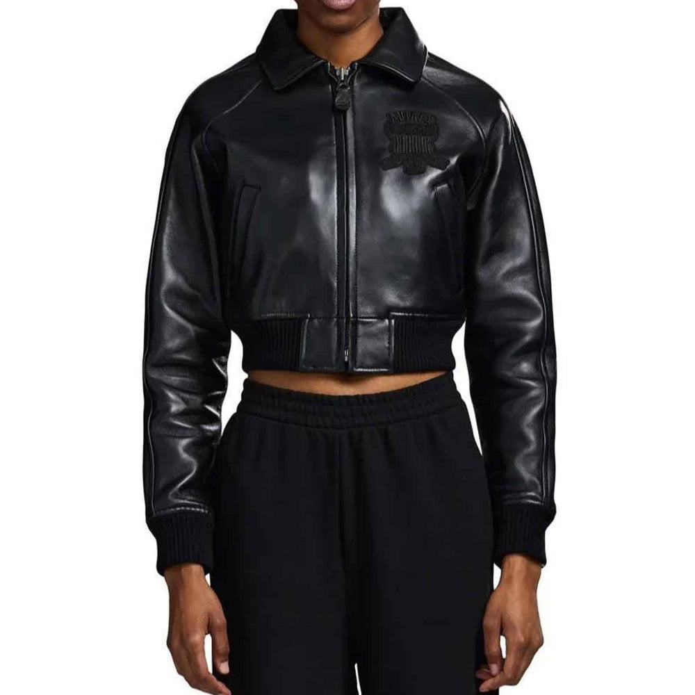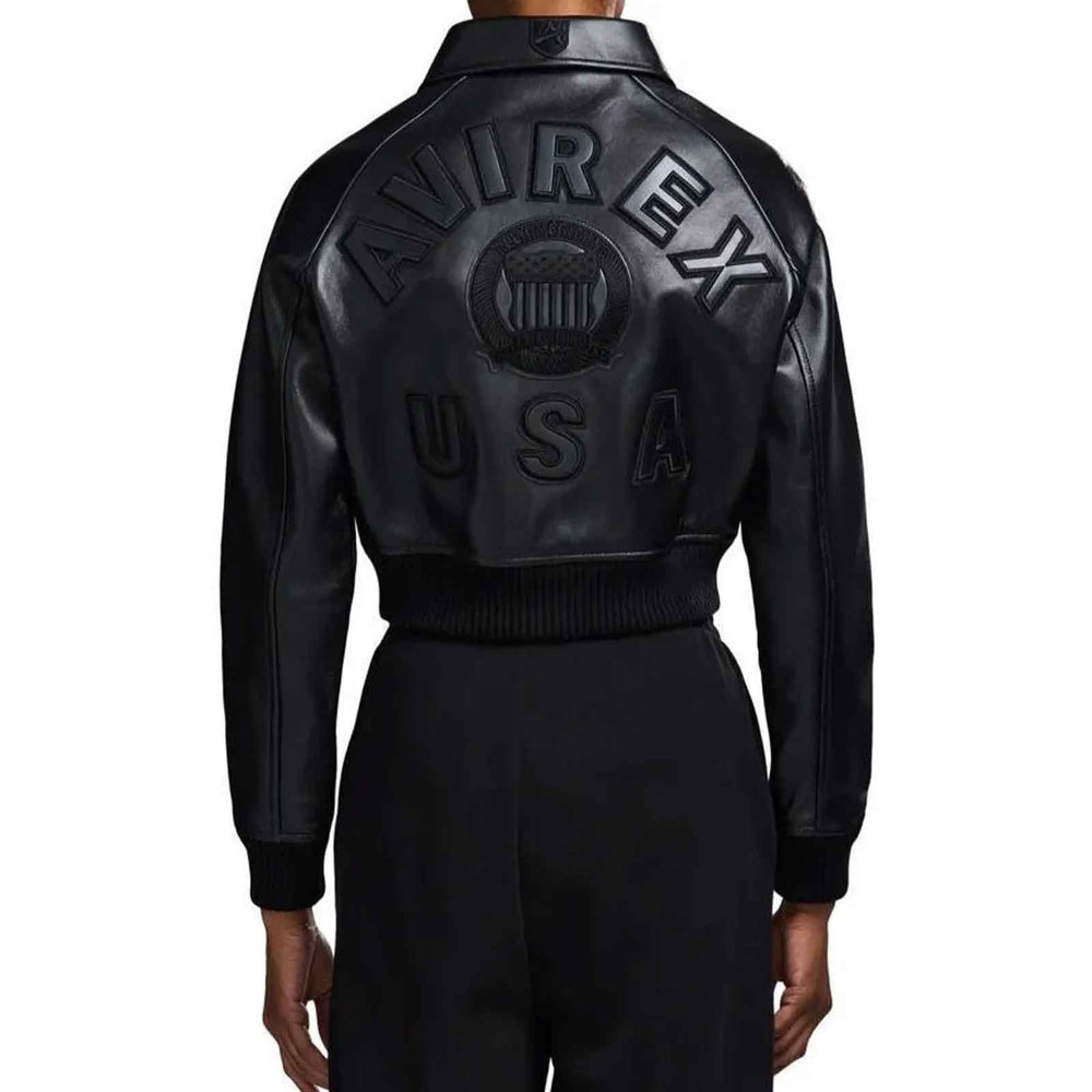 Upgrade your streetwear wardrobe with the Avirex Cropped Icon Black Leather Jacket for Women, expertly crafted from premium genuine cowhide leather for long-lasting durability and a luxury feel. Designed in a modern cropped bomber silhouette, this varsity-inspired jacket blends iconic Avirex heritage with contemporary fashion trends.