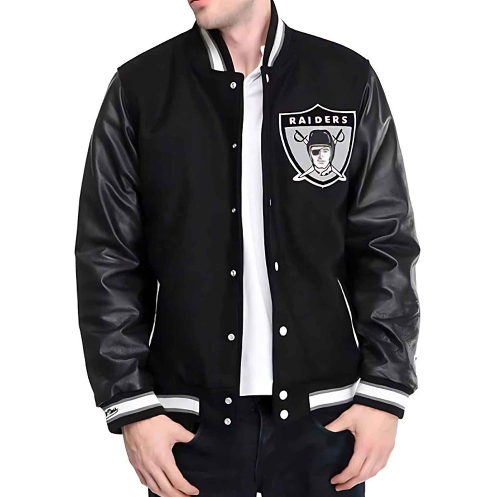 Show off classic team style with this NFL Raiders Varsity Jacket, designed in a timeless black colorway with a premium wool body and genuine leather sleeves. Inspired by traditional American letterman jackets, this piece delivers both comfort and iconic sports fashion.